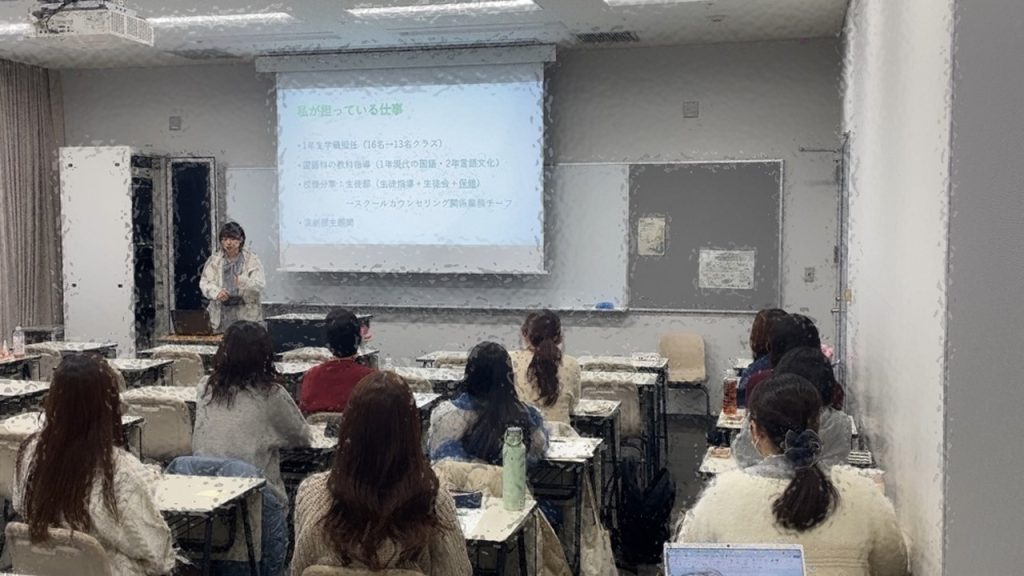2025年11月24日の午後に現在、愛知県で小学校の先生として活躍している教育発達学科の卒業生に卒業生講座にお越しいただきました。講座の中では、先生のお仕事や、その仕事のやりがい、苦労している点、教員採用試験に向けた対策や大学生のうちにやっておくと良いことなどをお話しいただきました。先生になるうえでは学生のうちに息抜きの方法を見つけたり、ご飯を早く食べることができるようになったりすることが重要ということであったり、子どもたちとの関わり、校務分掌や給与の実際などを含めて、なかなか大学では聞くことができないような実体験にもとづくお話を率直に語っていただきました。